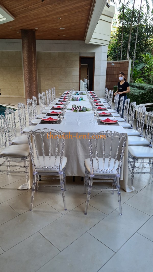 บริการให้เช่า ชุดโต๊ะเหลี่ยมเก้าอี้คริสตัล ลูกค้าเช่าชุดโต๊ะเหลี่ยมคลุมผ้าขาพร้อมเก้าอี้คริสตัล ลูกค้าจัดงานริมสระว่ายน้ำ ที่สุขุมวิท คลองเตย เป็นงานจัดเลี้ยงเก๋ๆ ดูดีมีสไตล์