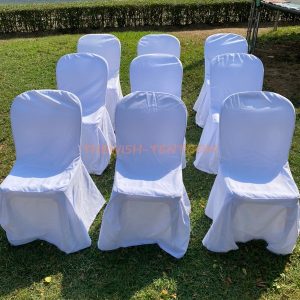 เช่าเก้าอี้พลาสติกสีขาว สามารถเลือกแบบคลุมผ้า และผูกโบว์สีทอง ใช้สำหรับงานเลี้ยงโต๊ะจีน งานสังสรรค์ งานทำบุญบ้าน