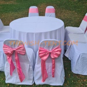 เช่าโต๊ะ-โต๊ะจีน1.5ม.เก้าอี้บุนวมคลุมผ้าขาวโบว์สีชมพู