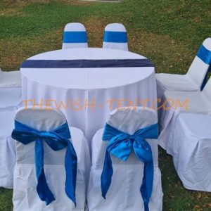 เช่าโต๊ะ-โต๊ะจีน1.5ม.+เก้าอี้พลาสติกคลุมผ้าสีขาว+โบว์สีน้ำเงิน