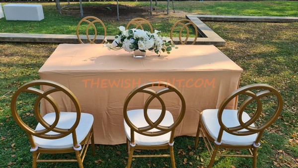 ให้เช่าเก้าอี้Rose Gold เช่าโต๊ะเหลี่ยมสีทอง : โต๊ะเหลี่ยม ขนาด 1.80 ม. คลุมผ้าขาวถึงพื้นพร้อมเก้าอี้ Rose Gold +เบาะหนังสีขาว 6 ตัว ราคาชุดละ 980 บาท (ไม่รวมผ้าคาดหน้าโต๊ะ)