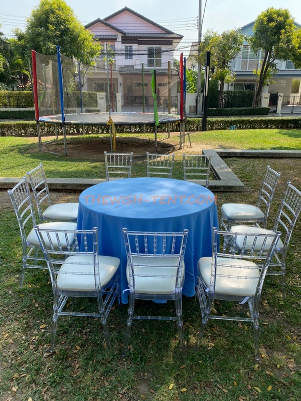 เช่าโต๊ะ-โต๊ะจีนผ้าสีฟ้า-เก้าอี้ชิวารี_คริสตัล เช่าโต๊ะจีน พร้อมเก้าอี้คริสตัล ประกอบด้วย โต๊ะกลมกลาง ขนาด 1.20 เมตร คลุมผ้าขาวพร้อมเก้าอี้คริสตัลและเบาะหนังสีขาว 10 ตัว ราคาชุดละ 1,600 บาท