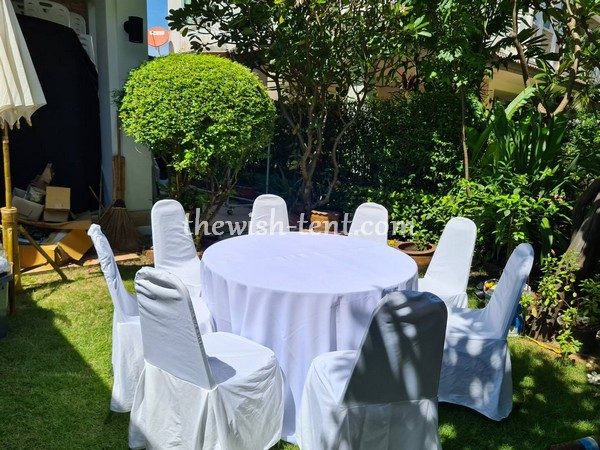 โต๊ะจีน+เก้าอี้บุนวมคลุมผ้า ประกอบด้วย -โต๊ะกลางคลุมผ้าสีขาวขนาดเส้นผ่าศูนย์กลาง 1.20 ม.พร้อมเก้าอี้บุนวม 8 ตัว คลุมผ้าสีขาว ราคาชุดละ 600 บาทต่อวัน