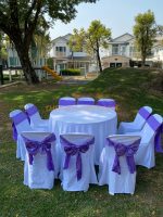 รายละเอียด เช่าโต๊ะ-โต๊ะจีน1.5ม.+เก้าอี้พลาสติกคลุมผ้าสีขาว+โบว์สีม่วง :