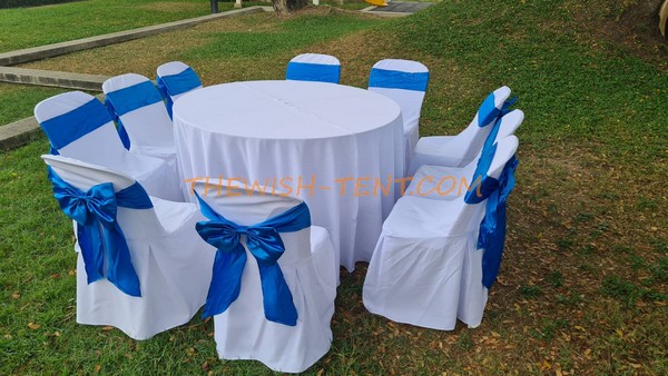 บริการให้ เช่าชุดโต๊ะจีน เก้าอี้พลาสติกคลุมผ้าและผูกโบว์สีน้ำเงิน เช่าชุดโต๊ะจีนคุลมผ้าสีขาว ประกอบด้วย โต๊ะจีนกลม คลุมผ้าขาว เส้นผ่าศูนย์กลาง 1.50 ม. จำนวน 1 ตัว และเก้าอี้พลาสติกคลุมผ้าสีขาวพร้อมผูกโบว์สีน้ำเงิน 10 ตัว ราคาชุดละ 480 บาท