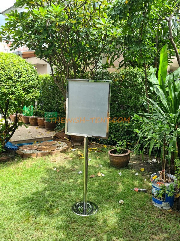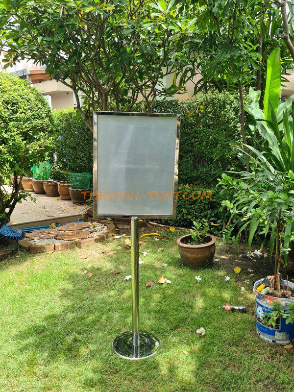 บริการให้ เช่าโปสเตอร์สแตน สีเงิน ป้ายโฆษณาโปสเตอร์สแตนด์ทำจากสแตนเลส ขนาดกรอบ (วัดด้านใน) 50 x 70 เซนติเมตร ความสูง 170 เซนติเมตร ฐานกลมทึบ สามารถใส่งานพิมพ์ได้ 2 แผ่น มองได้ 2 ด้าน ราคาเช่าต้นวันละ 350 บาท , พร้อมให้บริการให้เช่าเต็นท์ขาวสะอาด และอุปกรณ์จัดงานครบวงจรคุณภาพดีมีจำนวนมากส่งเร็วตรงเวลา เช่าโต๊ะ เช่าเก้าอี้ เช่าเต็นท์ บริการ – เช่าเต็นท์, เช่าเก้าอี้, เช่าโต๊ะ