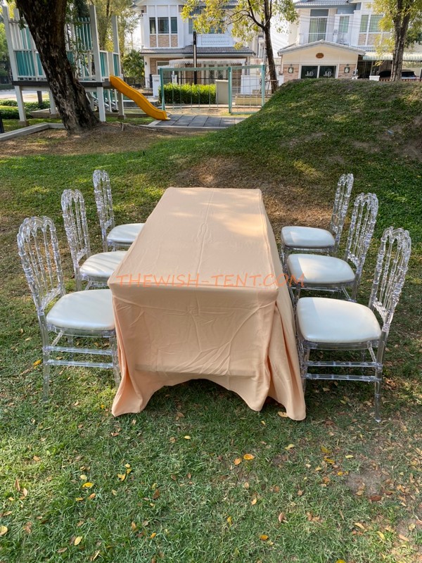 สามารถติดต่อสั่งจอง เช่าชุดโต๊ะเหลี่ยม-เก้าอี้คริสตัล(เจ้าหญิง) เช่าโต๊ะเหลี่ยม พร้อมเก้าอี้คริสตัล ประกอบด้วย โต๊ะเหลี่ยมกลาง ขนาด 1.80 เมตร คลุมผ้าขาวพร้อมเก้าอี้คริสตัลและเบาะหนังสีขาว 6 ตัว ราคาชุดละ 1,100 บาท ได้โดยตรงหรือส่งรายละเอียดให้เราผ่านทางหน้าเว็บไซต์ (ขอใบเสนอราคา)