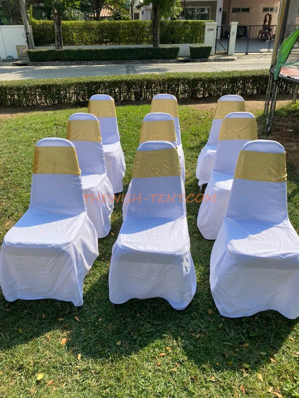 เช่าเก้าอี้-บุนวมคลุมผ้าสีขาวพร้อมผูกโบว์สีทอง เช่าเก้าอี้-เก้าอี้บุนวมทรงเอคลุมผ้าสีขาวพร้อมผูกโบว์สีทอง ใช้สำหรับงานเลี้ยง งานสังสรรค์ งานพิธีทั่วไป ราคา 65 บาทต่อวัน