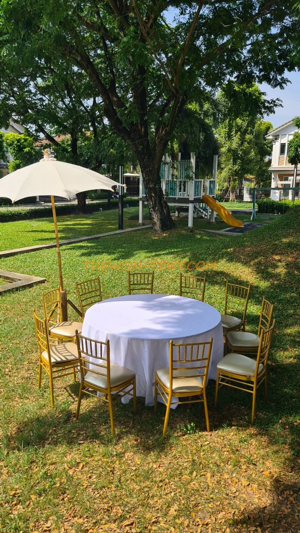 บริการให้ เช่าชุดโต๊ะจีน+เก้าอี้ชิวารีสีทอง เช่าโต๊ะจีน ให้เช่าโต๊ะจีน เช่าชุดโต๊ะกลม โต๊ะกลาง ขนาด 1.50 ม. คลุมผ้าขาวถึงพื้นพร้อมเก้าอี้ชิวารีสีทอง+เบาะหนังสีขาว 10 ตัว ราคาชุดละ 1,400 บาท และบริการให้เช่า ชุดรดน้ำสังข์ พัดลมไอเย็น พัดลมไอน้ำ เต็นท์ โต๊ะจีน โต๊ะเหลี่ยมหน้าขาว เก้าอี้ เก้าอี้ชิวารี เก้าอี้คริสตัล โซฟาสีขาว ร่มเชียงใหม่ ร่มสนาม และอุปกรณ์จัดงานอื่น ๆ