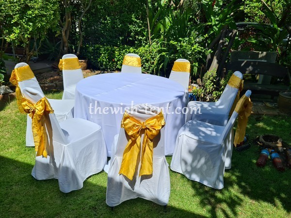เช่าโต๊ะจีน ให้เช่าโต๊ะจีน เช่าชุดโต๊ะจีน 1.2ม. ประกอบด้วย โต๊ะกลมกลาง ขนาด 1.20 ม. คลุมผ้าขาว พร้อมเก้าอี้บุนวมคลุมผ้าสีขาว 8 ตัว + โบว์สีทอง ราคาชุดละ 650 บาท