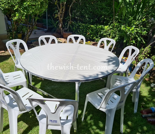 เช่าชุดโต๊ะจีน 1.5เมตร+เก้าอี้พลาสติกไม่คลุมผ้า ประกอบด้วย โต๊ะจีนขนาดเส้นผ่าศูนย์กลาง 1.50 ม. พร้อมเก้าอี้พลาสติกสีขาว 10 ตัว ราคาชุดละ 300 บาทต่อวัน
