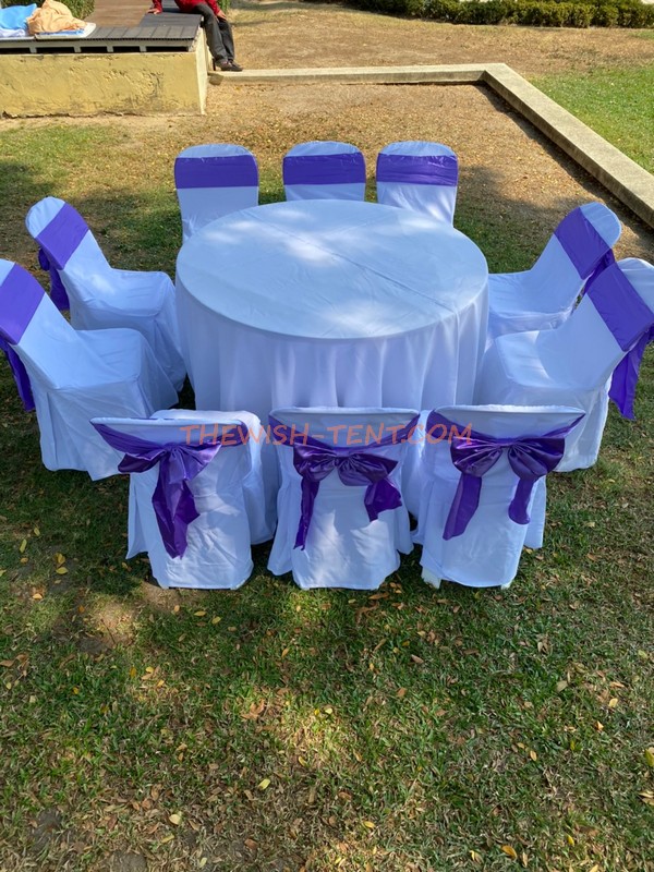 รายละเอียด เช่าโต๊ะ-โต๊ะจีน1.5ม.+เก้าอี้พลาสติกคลุมผ้าสีขาว+โบว์สีม่วง :